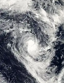 Late on November 16 a weak tropical disturbance formed to the north-west of Tuvalu embedded within the South Pacific Convergence Zone.[5][19] The disturbance did not have any organised convection near the low level circulation centre and was located in an area of low vertical wind shear.[19] Early the next day whilst the organisation of the system had not improved much, there had been enough of an increase in convection in the northern and southern quadrants for RSMC Nadi to designate the disturbance as Tropical Depression 04F.[20] Over the next couple of days the depression gradually moved towards the south-west before the low level circulation center was relocated to the north of Vanuatu early on November 19.[21][22] The depression continued to gradually develop, with a Tropical Cyclone Formation Alert being issued late on November 21 as convection had erupted about the low level circulation centre with bands of convection wrapping around the low level circulation significantly.[5][23][24][25]