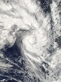 The FMS subsequently estimated during October 24, that the system had peaked as a Category 4 Severe Tropical Cyclone with 10-minute sustained wind speeds of 175 km/h (110 mph), while it was located about 220 km (135 mi) to the east of Vanua Lava in northern Vanuatu.[5][6] The JTWC also estimated during October 24, that the system had peaked with 1-minute sustained wind speeds of 215 km/h (135 mph), which made it equivalent to a category 4 hurricane on the Saffir-Simpson hurricane wind scale.[7] Over the next day the system maintained its peak intensity as it moved south-eastwards, before it turned westwards during the next day towards Vanuatu and rapidly weakened after it moved into an area of cooler sea-surface temperatures and strong vertical wind-shear.[5][6][10] As a result, during October 26, The FMS and JTWC both reported that the system had weakened into a tropical depression, before the systems remnants were last noted by the FMS during October 28.[5][12] On the Santa-Cruz Islands of Utupua and Vanikolo some minor tree damage was reported, while extensive damage to food crops occurred at Tikopia.[5][10] However, Radio New Zealand reported that overall damage at Tikopia was considered to be light given the circumstances.[10] Strong and gusty winds, rough seas and moderate to heavy swells were reported within the eastern Vanuatuan islands, however, no significant damage was reported within the islands.[5][10]