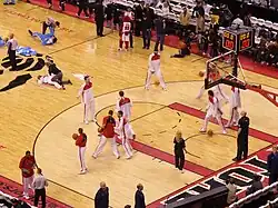 The first half of the season produced mixed results as Toronto struggled towards the .500 mark after a dismal 2–8 start.[8] Bosh's consistent performances however ensured he was named an All-Star starter in the 2007 NBA All-Star Game on 25 January 2007. He received the most votes after LeBron James among all Eastern Conference forwards.[11] A day later, the Raptors hit the .500 mark for the first time since the 2003–04 season after defeating the Boston Celtics at the Air Canada Centre.[12] On 2 February, the Raptors went 24–23, the first time since 2001–02 that they had been over .500 this late in a season.[13] As a result, the Raptors won three NBA Eastern Conference awards for the month of January: Player of the Month (Bosh),[14] Rookie of the Month (Bargnani)[15] and Coach of the Month (Sam Mitchell).[16] On 4 February, the Raptors' 122–110 home win against the Los Angeles Clippers represented a season-high in points for the Raptors.[17] Within the same week, Bosh's career-high 41 points in a win against the Orlando Magic prompted an unheard of event at the Air Canada Centre—chants of "MVP" by the home fans.[18] This chant was repeated in a win against Vince Carter's New Jersey Nets ten days later—to the disbelief of Carter—a game which also saw the team break franchise records for the most home wins and highest home winning percentage entering the All-Star break.[19][20]