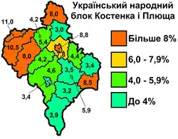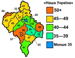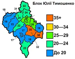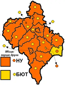 ![]() Results for districts. Orange is Our Ukraine Bloc, Yellow is Yulia Tymoshenko Bloc. | |||||||||||||||||||||||||||||