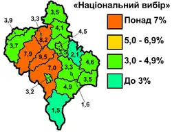 The greatest support for the region's third party Ukrainian National Bloc was shown in the western corner of Ivano-Frankivsk Oblast where in the Bolekhiv municipality and the Dolyna Raion the party managed to make over 10% mark. Also, remarkable performance of the Revival of Prykarapattya that even though barely made it to the regional council it had a substantial support in the Verkhovyna Raion where it, however, became the third party. Revival of Prykarpattya also became third in the Kolomyia municipality and the Kolomyia Raion.