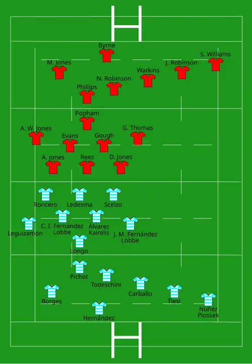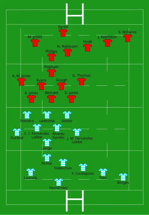 Ian Evans and Alun Wyn Jones started the match to earn their first caps for Wales, while Richard Hibbard and James Hook were named on the bench.[11] Evans scored a 45-metre interception try to put Wales in front after Juan Manuel Leguizamón had controversially cancelled out Mark Jones' third-minute opening score; after Juan Martín Fernández Lobbe charged down a clearing kick from Mike Phillips, referee Alain Rolland deemed Leguizamón to have grounded the ball before it reached the dead ball line, although video replays gave evidence to the contrary. José María Núñez Piossek's try and a pair of penalties from Federico Todeschini meant the home side took a 20–12 lead into half-time, helped by the sin-binnings of Wales back-row forwards Gavin Thomas for dissent and Alix Popham for collapsing an Argentina maul. Two penalties from Nicky Robinson reduced the margin to two points, but Francisco Leonelli put Argentina 27–18 up with three minutes of the game to go. Hook scored a try in injury time, converted by Robinson, but it proved mere consolation.[12]