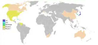 The first two rounds had a round-robin format, which led to two teams being eliminated on run difference tiebreakers: in the first round, Canada was eliminated despite its 2–1 record, due to a blowout loss to Mexico as well as failing to run up the score on South Africa; and in the second round, eventual champion Japan advanced despite its 1–2 record, due to a blowout win over Mexico and losing more narrowly to South Korea than did the United States. The higher-seeded teams generally advanced to the second round, including Puerto Rico and Venezuela, as well as the teams mentioned elsewhere in this summary.
