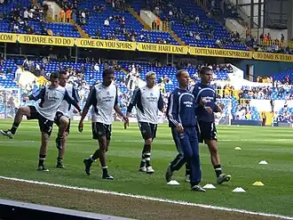 Newcastle United players warming up at White Hart Lane prior to a Premier League match against Tottenham Hotspur, 30 March 2008