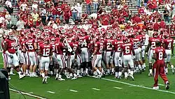 On July 19, a preseason poll voted on by members of the media that cover the Big 12 was released. The Sooners were chosen to finish second in the Big 12 South behind Texas. They finished nine votes behind the Longhorns but 44 points above Texas A&M, the third team.[1] This poll was released in anticipation of the Big 12 media day which began on July 23, 2007. Most publications had the Sooners ranked between five and ten in the preseason.[2][3][4][5] Phil Steele's self-titled publication, which is considered by many to be the most accurate college football preseason prediction magazine,[6] had the Sooners ranked number three in terms of how they would finish the year and how strong the team is going into the year.[7] On August 2, 2007, Coach Bob Stoops announced at a rally that the names of players would be put back on the team's jerseys. They had been removed in a re-design before the 2006 season.[8]