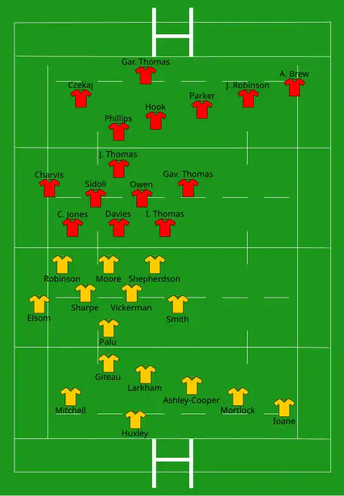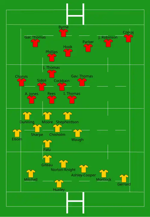 Australia named their team for the first test four days before the match. Julian Huxley was named to earn his first cap at full-back, while utility back Matt Giteau was named at scrum-half in favour of George Gregan, who was one of two backs on the bench. Flanker Phil Waugh recovered from an ankle injury in time to be named as captain of the team. Wing Drew Mitchell, centre Adam Ashley-Cooper and prop Matt Dunning all made their first appearances for the Wallabies since 2005.[21] Wales named their line-up the next day, the highlight being captain Gareth Thomas's selection on the wing for his 93rd cap, overtaking Gareth Llewellyn as the most capped player for Wales; meanwhile, centre Gavin Henson was named on the bench, and coach Gareth Jenkins said he was "likely to play a part in the game at some stage". In the forwards, Jonathan Thomas was named at number 8 ahead of Michael Owen, while Matthew Rees won the battle with Richard Hibbard to start at hooker. Uncapped prop Ceri Jones was named on the bench.[22]
