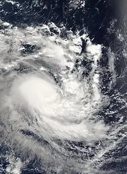 The origins of Dongo can be traced back to an area of low pressure that formed far from land late on January 7.[39][40] At 06:00 UTC, MFR designated it as a Zone of Disturbed Weather 1,530 km (950 mi) northeast of Mauritius.[39] However, strong wind shear was expected to inhibit short-term development.[41] A few hours later, MFR further upgraded the low to a tropical disturbance.[42] At 1500 UTC, the JTWC issued a Tropical Cyclone Formation Alert.[43] Situated along the edge of a low-mid level ridge, the disturbance tracked towards the southwest. Despite a brief decease in convection,[44] at 0600 UTC on January 9, MFR upgraded the disturbance to a tropical depression.[45] Shortly after, the depression was upgraded to Moderate Tropical Storm Dongo. At the time of the upgrade, Dongo began to turn more towards the south as further development of the storm was anticipated.[46] Roughly three hours later, the JTWC began issuing advisories on Tropical Cyclone 06S .[47] After weakening slightly early on January 10,[48] Dongo began to turn towards the southeast. Subsequently, convection rapidly decreased, leaving the center partially exposed even though conditions were favorable for intensification.[49] Six hours later, however, Dongo intensified into a severe tropical storm while reaching its peak intensity with winds of 95 km/h (60 mph 10-minute winds)[50] with a minimum pressure of 984 hPa (mbar)[40] according to MFR. Furthermore, Dongo peak with winds of 100 km/h (65 mph 1-minute winds) according to the JTWC[51] about 1,240 km (770 mi) east-southeast of Mauritius.[40]
