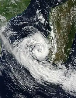 Tracking towards the south-southeast, Dongo approached cooler waters[52] and began to transition into an extratropical cyclone. Wind shear was also increasing over the storm in response to an approaching upper-level trough.[53] Despite moving over cooler waters, the storm remained a severe tropical storm until being declared extratropical at 0600 UTC on January 12.[40] Several hours later, the JTWC issued their final advisory on the system[54] Early on January 13, MFR followed suit,[55] though it was later believed to have completed such transition earlier.[40]
