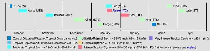 As predicted by the sub regional office of Mauritius ten named storms formed in this basin.[1] It officially began on November 15, but began 1 month earlier when Tropical Storm Asma formed on October 16. Most of the storms that formed this year were weak or stayed at sea. Only two storms reached hurricane strength this year, both of which were Category 3 or higher, and only 3 storms made landfall in the entire season. Overall, the impact of this season was relatively minor, but damaging for Madagascar, due to the heavy rains from Eric, Fanele, Izilda and Jade.