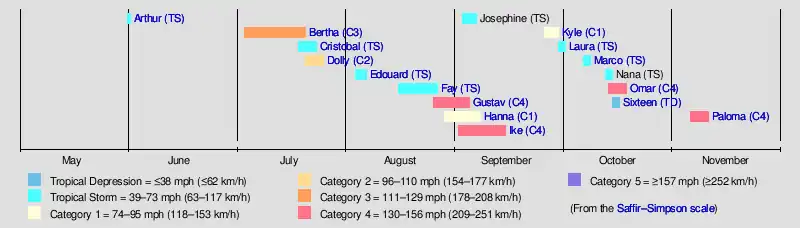 The 2008 hurricane season officially began on June 1,[22] though Tropical Storm Arthur formed one day earlier.[23] The season was above-average, featuring 16 named storms, 8 of which intensified into hurricanes, while 5 of the hurricanes reached major hurricane status.[24] Despite a La Niña dissipating early in the summer months, atmospheric conditions remained favorable for tropical cyclogenesis, including abnormally low wind shear between 10°N and 20°N. Additionally, sea surface temperatures in the deep tropics and the Caribbean Sea were fifth warmest since 1950.[25] The season saw the first occurrence of major hurricanes in the months of July through November.[26] Four storms formed before the start of August,[24] and the season also had the earliest known date for three storms to be active on the same day: Hurricane Bertha, and Tropical Storms Cristobal and Dolly were all active on July 20.[27] This season was also one of only ten Atlantic hurricanes seasons on record to have a major hurricane form before August,[28] as well as one of only seven Atlantic seasons to feature a major hurricane in November.[29] The final tropical cyclone, Hurricane Paloma, degenerated into a remnant low-pressure area over Cuba on November 9,[30] three weeks before the season officially ended on November 30.[22]