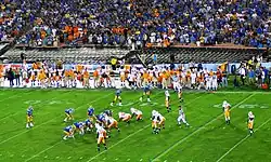 UCLA went ahead in the first quarter when Sean Westgate returned a blocked-punt for a 17-yard touchdown. After throwing four interceptions in the first half, Kevin Craft threw a 3-yard pass to Ryan Moya in a 70-yard drive that gave UCLA the lead late in the fourth quarter. Then Tennessee's Daniel Lincoln's 47-yard field goal tied the game with no time in regulation. But Kai Forbath kicked a 42-yard field goal to give the Bruins a 27–24 lead in overtime. The Volunteers were unable to match the Bruins in overtime when Lincoln's field goal attempt went wide left.[3]