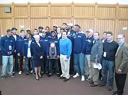 Players and coaches, joined by Connecticut Governor Dannel Malloy and Lieutenant Governor Nancy Wyman, pose with the championship trophy