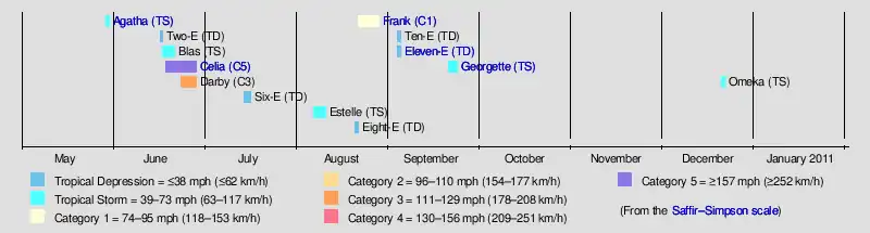 The first system of the season, Agatha, developed on May 29 near the coast of Guatemala. In the second week of June, a sudden spree of tropical cyclones developed, and between June 16 and 22, four cyclones formed, including the two major hurricanes of the season, Celia and Darby, the first of which reached Category 5 intensity. This near-record activity was a reversal from the previous season, when no storm formed until June 18. Following this activity, July saw zero named storms. In August and September only 2 tropical storms and one hurricane formed. Tropical Depression Eleven-E caused a great deal of flooding in southern Mexico, causing millions of dollars in damage, as well as causing over 50 deaths and $500 million in damage in areas of Oaxaca and Guatemala. Tropical Storm Omeka was a rare off-season storm.