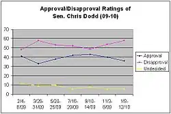 In December 2008, it was reported that Dodd had a little less than $670,000 banked for a re-election campaign, far less than other senators anticipated to seek re-election.[9] In February 2009, a poll indicated that Dodd's favorability ratings were slipping, and many Connecticut voters were not satisfied with Dodd's explanations regarding the mortgage.[10]