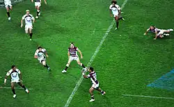 Manly's winning streak came to an end in late June, when the team was defeated by the reigning premiers St George Illawarra.[19] The match was played a week after the death of the well-known former Manly player turned commentator Rex Mossop.[20] Manly returned to winning form quickly, defeating South Sydney in their next match,[21] before thrashing Newcastle, 32–10,[22] and defeating Penrith, 12–8.[23] A defeat to the Wests Tigers followed, in a home game that Manly decided to play at Gosford's Central Coast Stadium.[24] Manly responded to the defeat to the Tigers with another winning streak, beating the Sydney Roosters, the Parramatta Eels and the Canterbury Bulldogs in successive weeks. The cost to Manly was an injury to their co-captain Jason King in the Roosters match. He would miss the remainder of the season with a torn pectoral muscle.[25]