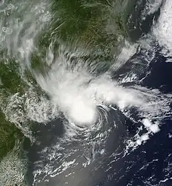 Despite light rainfall and gusty winds on islands such as Barbados, Martinique, and Puerto Rico, impact from Ernesto in the Lesser Antilles was negligible.[24] Rip currents along the coast of the Florida Panhandle resulted in at least 10 lifeguard rescues at Pensacola Beach, while a portion of a store in the same city was washed away.[40][41] In Mexico, officials reported that 85,000 people in Majahual lost power; roads were damaged elsewhere in state of Quintana Roo. Freshwater flooding occurred along the coast of the Bay of Campeche, including in Coatzacoalcos, Veracruz. Flooding and several landslides lashed mountainous areas of Veracruz, Puebla, and Oaxaca. Officials indicated that 10,000 houses were partially damaged by flooding in Veracruz. Flooding occurred well inland in association with the remnants of Ernesto. In Guerrero, at least 81 municipalities were impacted and 5 fatalities were reported.[24] Overall, Ernesto was responsible for 12 deaths and about $174 million in damage.[24][42]