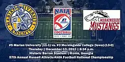 The 2012 NAIA football national championship was played on December 13, 2012 as the 57th Annual Russell Athletic NAIA Football National Championship. The game matched the once-beaten and 5th-ranked Knights from Marian University against the undefeated and 3rd-ranked Mustangs from Morningside College. The game matched two teams making their first appearance in the championship game, assuring someone would win the title for the first time. The teams proved to be evenly matched, and the outcome was not decided until the winning points were scored in the first round of overtime. With their winning field goal, the Marian Knights prevailed, 30-27 in the first overtime game in NAIA football championship history.[1]