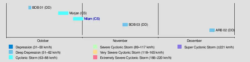 The first depression of the season developed out of the remnants of Severe Tropical Storm Gaemi on October 10, 2012, very late into the 2012 cyclone season, about 350 km (215 mi) southeast of Kolkata, West Bengal. and brought high winds and heavy rains to much of Bangladesh, causing extensive damage. The storm killed a total of 30 people. On October 23, the second depression of the season developed out of a persistent low in the Arabian Sea and soon became the first cyclonic storm of the season Murjan. Only two days later, the third depression of the season formed in southern Bay of Bengal and gradually strengthened into Cyclonic Storm Nilam. The cyclone made landfall over Southern India early on October 31 and dissipated on November 2.