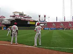 The Phillies were 64–70 and were 8 games behind the second Wild Card team St. Louis Cardinals after their series with the Braves on September 2. The Phillies will try to make an impressive late run to make the Wild Card. The Phillies started the month of September by taking 2 of 3 from the Cincinnati Reds. Then, the Phillies caught fire in the wild card standings, by sweeping both the Colorado Rockies and Miami Marlins in a 3-game series to climb back up above .500 for the first time since June 3, partly due to strong performances by Jimmy Rollins shortly after coming back after getting benched when he did not hustle after a pop-up on August 30.[25] Meanwhile, the teams ahead of them struggled, with the Pittsburgh Pirates losing 6 in a row and the Cardinals and Los Angeles Dodgers losing 6 of their last 7 games. As a result, the Phillies were just 3 games behind the Cardinals on September 12.[26] However, just as it seemed like the Phillies were going to make an improbable run to the playoffs, disaster stroke in the next series against the Houston Astros. Mainly due to bad pitching performances, the Phillies lost 3 of 4 to the last-place Astros and were 4 games back after the series. This was also when the Phillies were eliminated from winning the division with a 6–7 loss on September 16.[27] However, the Phillies tried to rebound. They then had their revenge on the New York Mets for the tough losses they gave the Phils this season by sweeping them. This includes a come-from-behind 3–2 when Ryan Howard hit a 2-run home run when the Phillies were down to their final out and a huge blowout 16–1 win when the Phillies scored 8 runs on the road in the first inning for the first time since 1912. Despite the sweep, the Phillies were unable to pick up any games as the Cardinals started getting hot around this time. Then in the next series against the Atlanta Braves, although they would win the first game to climb back to 3 games behind the Cardinals, they would lose the final 2 games which sunk them to 51⁄2 games behind the Cardinals and majorly damaged their playoff hopes. However, in game 2 of the series, Ryan Howard hit his 300th career home run after 1,093 games, becoming the second fastest player to hit the 300th homer.[28] The Phillies were unable to keep their now very slim playoff chances alive by taking just 1 of 3 from the Washington Nationals. However, Darin Ruf, who recently joined the Phillies from the minor leagues, saw that his first hit was also his first home run.[29] Their playoff chances then ended for good when the Phillies loss the first game of the next series against the Marlins on September 28.[30] The Phillies would then finish the year by winning the next 2 games against the Marlins, but would win only 1 of 3 from the Nationals. The Phillies would finish the year 81–81. Although it was impressive to recover from 14 games behind .500 in just half a season, this season was their first non-winning season since 2002.[31] The Phillies already fired first base coach Sam Perlozzo, bench coach Pete Mackanin and hitting coach Greg Gross.