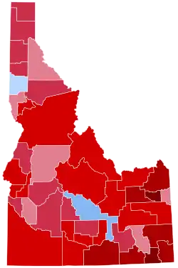 The 2012 United States presidential election in Idaho took place on November 6, 2012, as part of the 2012 United States presidential election in which all 50 states plus the District of Columbia participated. Idaho voters chose four electors to represent them in the Electoral College via a popular vote pitting incumbentDemocraticPresidentBarack Obama and his running mate, Vice PresidentJoe Biden, against Republican challenger and former Massachusetts GovernorMitt Romney and his running mate, CongressmanPaul Ryan. Prior to the election, 17 news organizations considered this a state Romney would win, or otherwise considered as a safe red state. Romney and Ryan carried Idaho with 64.09% of the popular vote to Obama's and Biden's 32.40%, thus winning the state's four electoral votes.[1] Romney's victory in Idaho made it his fourth strongest state in the 2012 election after Utah, Wyoming and Oklahoma.[2] He improved on McCain's performance in 2008, expanding his margin from 25.3% to 31.69% and flipping Teton County which had previously voted for Obama.