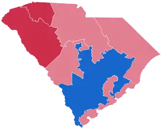 Romney defeated Obama in the state by 54.56% to 44.09%, a margin of 10.47%.[1] While the state is generally considered safe for the Republican Party, it remains somewhat competitive due to a high African-American population, the sixth-highest in the country.[2] The majority of the Democratic vote comes from the Black Belt, with areas such as Richland and Charleston counties, home to Columbia and Charleston respectively, providing high margins for the Democrats. However, this support is largely offset by suburban and rural white voters.[3] The state hasn't voted for a Democrat since Jimmy Carter carried it in 1976.[4] Romney also improved on John McCain's 8.97% margin in 2008.