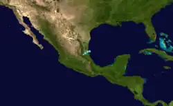 A tropical wave emerged into the Atlantic Ocean from the west coast of Africa on June 8. The system moved westward and an area of low pressure developed over the southwestern Caribbean Sea on June 16. The low then moved across Honduras,[31] where heavy rainfall triggered flooding that damaged 60 homes and affected 300 people.[32] The low later re-emerged into the Caribbean Sea and developed into a tropical depression at 12:00 UTC on June 17, while situated 60 mi (97 km) east of Monkey River Town. About 10 hours later, it made landfall near Big Creek, Belize.[31] In that country, an estimated 10 in (250 mm) of rain fell in 24 hours, causing several rivers to overflow their banks. In some areas, culverts were washed away. At least 54 people living along Hope Creek were relocated to shelters.[33] In El Salvador, flooding and lightning caused one fatality each.[31]