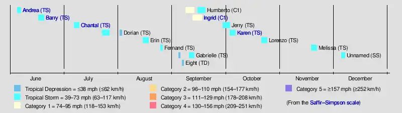 Tropical cyclogenesis began in early June, with the development of Tropical Storm Andrea in the Gulf of Mexico on June 5. Twelve days later, Tropical Storm Barry formed in the northwestward Caribbean Sea. Two named storms originated during the month of July—tropical storms Chantal and Dorian. Similarly, there were two tropical storms in August, Erin and Fernand. In September, four tropical cyclones formed, three of which strengthened into tropical storms; two of those reached hurricane status. The most intense tropical cyclone—Hurricane Humberto—peaked with maximum sustained winds of 90 mph (140 km/h) on September 11, which is a Category 1 on the Saffir–Simpson hurricane wind scale.[19] The other hurricane, Ingrid, was the most devastating storm of the season and peaked at slightly less intensity.[24] Activity began to slow in October, with the development of only two tropical storms, Karen and Lorenzo. Tropical cyclogenesis then halted for almost a month, until Tropical Storm Melissa formed over the eastern Atlantic Ocean on November 18. This was the only tropical cyclone in the month of November. The final system was an unnamed subtropical storm that developed south of the Azores on December 5. After meandering for two days, it degenerated into a remnant low-pressure area on December 7.[19]