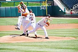 The Dodgers were rained out on April 19 at Camden Yards and forced to play a doubleheader the following day against the Baltimore Orioles. Their losing streak extended to six games after they lost both games of the doubleheader. In the first game, Andre Ethier hit a three-run homer in the first to stake the Dodgers to a 4–0 lead but Ryu allowed two home runs and the bullpen again failed as the team lost 7–5.[30] Manny Machado battered Beckett for a homer, double, single and 4 RBIs in the nightcap as the Orioles won 6–1.[31] The Dodgers woes continued when Chad Billingsley was scratched from his scheduled April 20 start and placed on the disabled list due to pain in his elbow. Stephen Fife was recalled from AAA Albuquerque to make the start.[32] The Dodgers did manage to end the six-game losing streak with a 7–4 victory in the series finale.[33] Mark Ellis hit two home runs in the Dodgers 7–2 victory over the New York Mets at Citi Field on April 23.[34] Ted Lilly made his first start of the season the following day and held the Mets to 1 run on 6 hits in 5 innings while striking out 7. Matt Kemp also hit his first home run of the season. However, the Mets tied the game in the bottom of the ninth and then won it with a walk-off grand slam by Jordany Valdespin off of Josh Wall in the bottom of the 10th.[35] The Dodgers got a two-run rally in the top of the ninth on the 25th to pick up a 3–2 win over the Mets in the final game of the road trip.[36]