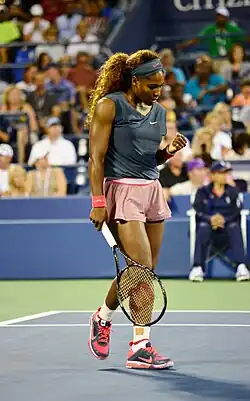Williams came into the French Open as the favorite, having not lost a match on clay and riding on a 24 match winning streak. Williams also was the top seed and world no. 1 and would come out of the event as the world no. 1 regardless of the result of the tournament.[46] In her opening match, she went up against Anna Tatishvili, where Williams rallied through to win the first nine games dropping only a point on serve before Tatishvili could get a game. Williams then won the remaining three games to advance.[47] In the next round, Williams faced wildcard Caroline Garcia. Williams won the first five games and finished it off the set in the seventh game and then broke twice in the second to take the match. Williams made 27 winners and 9 unforced errors to her opponents 14 a piece.[48] In the third round, Williams took on Sorana Cîrstea. Williams took the first set in a bagel, the second set went on serve until the fifth game, where Williams won the last four games. Williams was 13–16 on winners and unforced errors.[49] In the round of 16, Williams went against the no. 1 doubles player Roberta Vinci, Williams took the first set, dropping only a game. The second set went on serve until Williams broke in the eighth game and closed it out in the next game to win in straight sets.[50] In the quarterfinals, Williams faced former French Open champion Svetlana Kuznetsova. In the first set, Williams cruised through the set dropping only a game with the aid of 15 winners. However, in the second set, Kuznetsova won the first four games. Kuznetsova then served for the set in the ninth game and was up 40–0, however Williams squandered four break points in the game to bring it to a deciding set. Kuznetsova hit 11 winners to Williams' 8, while hitting the same number of unforced errors. Kuznetsova then broke early and had a chance to take a second break in the 3rd game, however Williams saved three break points to hold. Williams then won 5 of the last 6 game to advance to her first French Open semifinal since 2003.[51] In the semifinals, Williams faced last years runner-up Sara Errani. Williams stormed through the first 9 games before Errani could get her only game of the match. Williams then served it out in the seventh game in a 46-minute white wash, dropping only 5 points on serve. Williams hit 40 winners to her opponents 2 and 15 unforced errors to Errani's 3.[52] Chris Evert described this as the finest female performance on clay she had ever seen.[53] Williams faced defending champion and number 2 seed Maria Sharapova in the final. Williams was broken in the second game, but won four of the next five games to gain the lead. Sharapova then broke back in the eight game before Williams went on to break again to take the set in the tenth game. Williams proceeded to play well breaking Sharapova's serve in the second set before serving for the championship in the tenth game. In this service game, Williams fired 3 aces to win her second French Open title 11 years after her first. Williams hit 29 winners-21 unforced errors-10 aces-0 double faults to Sharapova's 10-17-2-4 in comparison. The win improved Williams' win-streak to a career-longest 31 matches.[54] She became the fourth woman in the Open era after Martina Navratilova, Chris Evert and Steffi Graf to win each Grand Slam title twice or more.