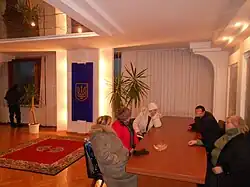 Protesters first seized the RSA of Vinnytsia; seven police officers were injured in the assault which drew over 1,000 opposition supporters,[37] but the remainder of police stood down peacefully to the cheers of protesters; governor Ivan Movchan not resigned.[38][39] Protesters managed to occupy the RSA building in Chernihiv, demanding the resignation of the governor.[40] Later that day, protesters occupied the chamber of the RSA in Poltava as 2,000 protesters overwhelmed 400 police,[41] forming an impromptu parliament named Nationalna Rada.[42] Uzhhorod was blockaded by protesters,[36] who were split between pro-government and anti-government factions.[43] In Sumy, over 5,000 citizens protested in front of the RSA building but did not attempt to take it.[44][45] 150 Kherson Residents block local regional state administration.[46] Also on 25 January, regional lawmakers in Lviv voted to establish a parallel government.[47] Mykolayiv was occupied by Party of Regions members, with the interior barricaded; opposition leaders were not allowed to enter.[48]
