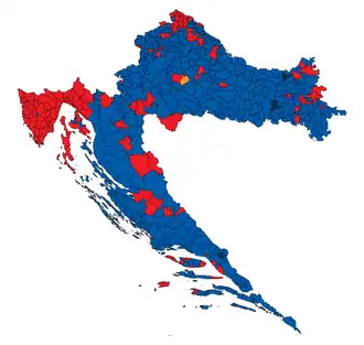 HDZ—>80% HDZ—70–80% HDZ—60–70% HDZ—50–60% HDZ—40–50% HDZ—<40% | SDP—>80% SDP—70–80% SDP—60–70% SDP—50–60% SDP—40–50% SDP—<40% | SZH—40–50% SZH—<40% Labour—<40% |