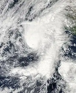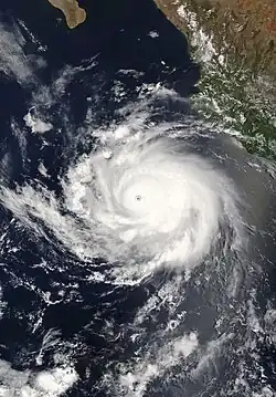 Continued, though less prolific, activity extended through September with four hurricanes developing that month. ACE values remained 45% above-average by the end of the month.[16] Following the rapid intensification of Hurricane Simon to a Category 3 hurricane during the afternoon of October 4, the 2014 season featured the highest number of major hurricanes in the Eastern Pacific basin since the advent of satellite imagery. With eight such storms east of 140°W, the year tied with the record set in the 1992 season.[17][18] However, this record was surpassed by the 2015 Pacific hurricane season.