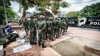 Anti-coup protests also took place outside Bangkok. In Chiang Mai Province, a group of people clad in black held anti-coup activities for days, including marching to the city's ancient walls where they performed a candle-lit ceremony opposing the military's action.[139] Some of them were apprehended by military on 24 May.[140] Anti-coup rallies also occurred in several other provinces. In Khon Kaen Province, students held a ceremony to bid farewell to democracy in front of Central Plaza Khon Kaen shopping mall where soldiers were stationed.[141] In Maha Sarakham Province, students held an anti-coup protest in the middle of the city but soldiers came and seized protest materials such as banners.[142] A group of Thais living in Australia held anti-coup activities at Kings Park, Perth, on 26 May.[143]