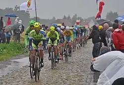 The first stage's bunch sprint finish was won by Marcel Kittel. A crash in the sprint caused Mark Cavendish, a favourite for the win, to fall; he did not start stage two.[42] Kittel gained the race leader's yellow jersey and the green jersey as the leader of the points classification, with Jens Voigt taking the polka dot jersey as the leader of the mountains classification.[43] In the following stage, likened to a "mini Liège-Bastogne-Liège",[44] Vincenzo Nibali took the stage win and yellow jersey, attacking on Sheffield's hilly terrain with 2 km (1.2 mi) remaining. Peter Sagan took the green jersey and Cyril Lemoine (Cofidis) took the polka dot jersey.[45] Stages three and four, finishing in London and Lille respectively, ended in bunch sprints and were both won by Kittel.[46] Crashes in stages four and five forced pre-race favourite Chris Froome to abandon the race; his injuries were later revealed to be fractures to his left wrist and right hand.[47] The weather was wet throughout the fifth stage, with the sett paving causing many crashes (although not Froome's). The fractured ending was won by an attack in the final 5 km (3.1 mi) by Lars Boom of Belkin Pro Cycling. Nibali, who placed third, extended his overall lead over his rivals, with Alberto Contador 2 min 37 s down.[48] André Greipel won stage six's bunch sprint in Reims.[49] Another bunch sprint took place at the end of the next stage, with the hilly finish decided by a photo finish between Sagan and the winner Matteo Trentin (Omega Pharma–Quick-Step).[50]