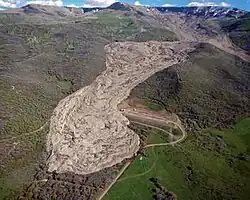 Unseasonably heavy rains during May 23–24 melted the local snowpack and saturated the ground to the point of instability.[8] A small landslide was recorded at approximately 7:18 AM on May 25, and minor slope movement was noticed throughout the day.[9] At 5:44 PM on May 25[10] a large chunk of the West Salt Creek valley headwall (known as the "slump block") collapsed catastrophically.[11] The initial collapse triggered a wave of subsequent rock failures (a "rock avalanche") that moved 2.8 miles (4.5 km) down the valley of West Salt Creek, burying almost 600 acres (240 ha) of land under 38 million yd3 (29 million m3) of debris.[1] The average speed of the landslide was about 45 miles (72 km) per hour,[6] with a maximum of 75 to 140 miles (121 to 225 km) per hour,[9] and its maximum depth reached 123 feet (37 m).[5] The slide descended a total of 2,300 feet (700 m) from the rim of the Grand Mesa to the valley below.[11] The speed of the slide was likely increased by a layer of liquefied material underneath the main rock avalanche.[7] Residents described the sound of the landslide as “a low flying, large military helicopter”, "a very long clap of thunder", or “a freight train coming”.[6]