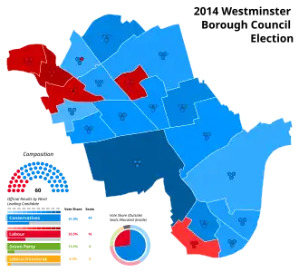 ![]() 2014 Westminster Borough Council Election Results Map Conservatives in blue and Labour in red. | |||||||||||||||||||||||||