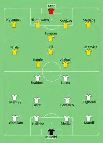 South Africa took the lead in the 51st minute, as Thuso Phala shot home a pass from Sibusiso Vilakazi. They missed the chance to increase the lead four minutes later after Tokelo Rantie's penalty, awarded for a foul on Vilakazi by Aïssa Mandi, hit the bar and went out, and conceded the equalizer in the 67th minute, as Thulani Hlatshwayo headed Yacine Brahimi's cross into his own goal. Algeria took the lead as Faouzi Ghoulam received Sofiane Feghouli's cross, ran into the penalty area and hammered past the goalkeeper, and sealed the win in the 83rd minute, after Ishak Belfodil fed Islam Slimani, whose shot squirmed through the goalkeeper's hands.[5][6]