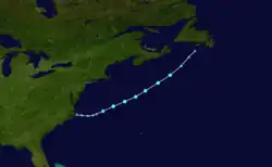 In early July, a shortwave trough embedded in the westerlies crossed the United States. The system emerged over the Atlantic near the Outer Banks of North Carolina on July 12; a surface low soon developed. Traversing the Gulf Stream, convection abruptly increased on July 13 and it is estimated that a tropical depression formed by 06:00 UTC that day, roughly 255 mi (410 km) east-northeast of Cape Hatteras. Six hours later, the depression intensified into a tropical storm and was assigned the name Claudette. The sudden development of the cyclone was not well-forecast,[39] and Claudette was not operationally warned upon until it was already a tropical storm.[40] Embedded within southwesterly flow ahead of mid-latitude trough, the storm moved generally northeast. Claudette reached its peak intensity around 18:00 UTC with winds of 50 mph (80 km/h) and a pressure of 1003 mbar (hPa; 29.62 inHg). Increasing wind shear on July 14 prompted weakening, displacing convection from the storm's center. It subsequently degenerated into a remnant low by 00:00 UTC on July 15. The remnants of Claudette were absorbed into a frontal boundary just south of Newfoundland later that day.[39]