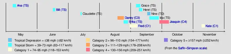 Tropical cyclogenesis began early, with Ana developing on May 8, over three weeks prior to the official beginning of the season and far ahead of the long-term climatological average of July 9. The month of June featured one tropical cyclone, Bill, which formed on June 16. Claudette, the only system in the month of July, developed on July 13. The rate of tropical cyclogenesis increased in August, though no storms developed in the first half of the month. Danny, the season's first major hurricane, formed on August 16, followed by Erika on August 24, and Fred on August 30. September, which is the climatological peak of hurricane season, featured five additional tropical cyclones – Grace, Henri, Tropical Depression Nine, Ida, and Joaquin. The most intense storm of the season was Joaquin, which peaked as a strong Category 4 hurricane with maximum sustained winds of 155 mph (250 km/h), just short of Category 5 on the Saffir–Simpson hurricane wind scale. Joaquin lasted into October, though no other systems developed that month. The season's final cyclone, Kate, developed on November 8 and became extratropical on November 11.[18] The season's activity was reflected with an Accumulated Cyclone Energy (ACE) rating of 63,[17] which was well below the 1981–2010 median of 92.[23]