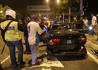 ![]() A policeman checking a Proton Wira damaged during the Low Yat riot. | |