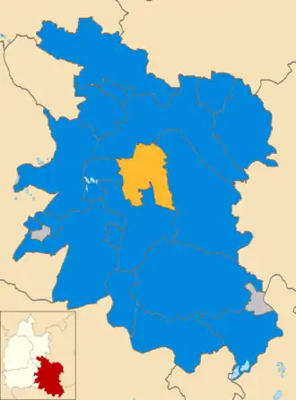 The Conservative Party's share of votes fell from 53.53% in 2011 to 50.65% in 2015. However, as a result of the new boundaries the Conservatives still won 33 seats in 2015,[4] the same number as in 2011. And as the Boundary Commission had reduced the number of seats, this represents an increase in the share of seats from almost 69% in 2011 to nearly 92% in 2015.