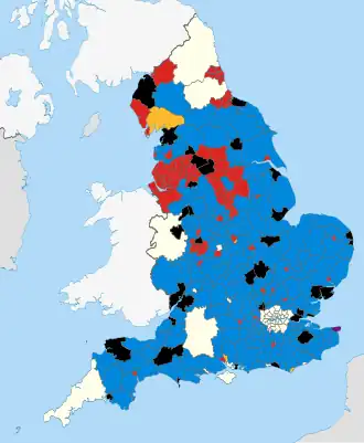 - ^ The English local government bodies which did not hold local elections were seven unitary authorities (Cornwall, Durham, the Isle of Wight, Northumberland, Isles of Scilly, Shropshire and Wiltshire), seven district and borough councils (Adur, Cheltenham, Fareham, Gosport, Hastings, Nuneaton and Bedworth and Oxford), and the 32 London boroughs.