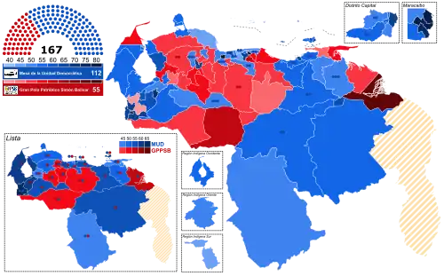 The MUD won 109 of the 164 general seats and all three indigenous seats, which gave them a supermajority in the National Assembly, while the GPP won the remaining 55 seats. Voter turnout was just over 74 percent.[3]