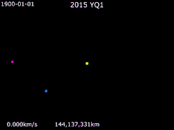 2015 YQ1 (also written 2015 YQ1) is an Apollo asteroid that is a temporary horseshoe companion to the Earth, the twelfth known Earth horseshoe librator.[6] It experienced a close encounter with the Earth on 2015 December 22 at 0.0037 AU.