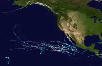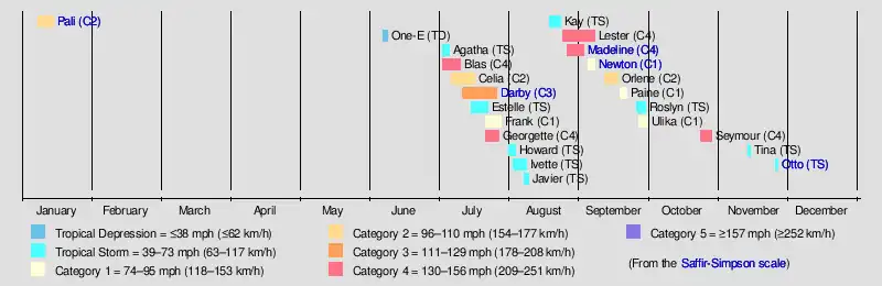 The 2016 Pacific hurricane season was tied as the fifth-most active Pacific hurricane season on record, alongside the 2014 season. Throughout the course of the year, a total of 22 named storms, 13 hurricanes and six major hurricanes were observed within the basin. Although the season was very active, it was considerably less active than the previous season, with large gaps of inactivity at the beginning and towards the end of the season. It officially started on May 15 in the Eastern Pacific (north of the Equator and east 140°W), and on June 1 in the Central Pacific (from 140°W to the International Date Line); they both ended on November 30.[1] These dates conventionally delimit the period of each year when most tropical cyclones form in these regions of the Pacific Ocean. However, tropical development is possible at any time of the year, as demonstrated by the formation of Hurricane Pali on January 7, the earliest Central Pacific tropical cyclone on record.[2] After Pali, however, no tropical cyclones developed in either region until a short-lived depression on June 6. Also, there were no additional named storms until July 2, when Tropical Storm Agatha formed, becoming the latest first-named Eastern Pacific tropical storm since Tropical Storm Ava in 1969.[3]