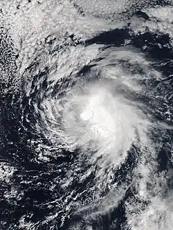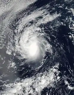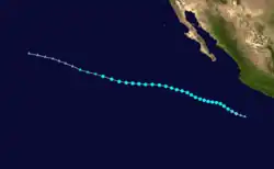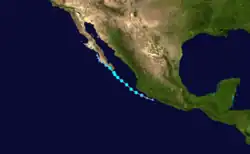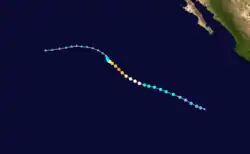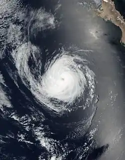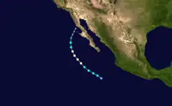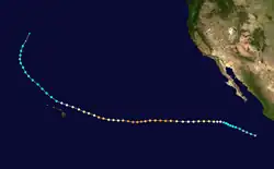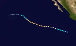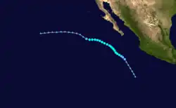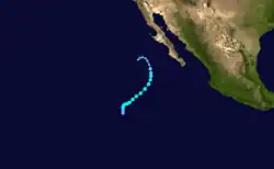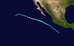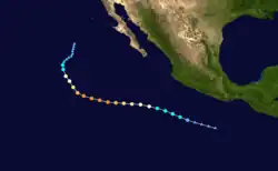 On July 15, the NHC noted that an area of low pressure was forecast to form well south of Mexico early the subsequent week.[88] An area of disturbed weather became established south of the Gulf of Tehuantepec the following day,[89] organizing sufficiently to be deemed a tropical depression by 21:00 UTC on July 21.[90] Despite moderate northeasterly wind shear, the depression intensified into Tropical Storm Georgette by 15:00 UTC on July 22 and was further upgraded to a Category 1 hurricane by 03:00 UTC on July 24.[91][92] Over a 24-hour period ending at 03:00 UTC July 25, the cyclone's maximum winds increased from 75 mph (120 km/h) to a peak of 130 mph (210 km/h) as convection became more symmetric and an eye cleared.[93] Progressively cooler waters and a more stable environment, however, caused Georgette to begin weakening soon thereafter: it fell below hurricane intensity by 15:00 UTC on July 26 and further degenerated into a remnant low well west-southwest of Baja California a day later.[94][95]