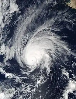 In the first two weeks of July, five low-pressure systems formed in the Eastern Pacific. The fourth of these was first noted by the National Hurricane Center on July 9; it was located in a favorable environment, and was expected to develop into a tropical storm.[57] On July 11, the low was upgraded into Tropical Depression Five-E.[58] On July 12, Five-E intensified into a tropical storm, and was assigned the name Darby; the next day it attained hurricane status.[59][60] It later strengthened into a Category 2 hurricane on July 15.[61] On July 16, despite traveling over cooler waters, Darby unexpectedly became a Category 3 hurricane.[62] However, 6 hours later, Darby weakened back to a Category 2.[63] Over the next four days, Darby gradually degraded over cooler waters as the storm moved westwards, towards Hawaii.[64] But, as it moved closer towards the area, it strengthened again, prompting several Tropical Storm warnings and watches to be issued for the Hawaiian Islands.[65] At 00:00 UTC July 24, it made landfall near Pahala of the Big Island.[66] Crossing the island as a minimal tropical storm, it was the first to do so since Hurricane Iselle in 2014. Slight weakening occurred as Darby traversed the island, however the storm retained minimal tropical storm strength as the storm began to move northwestwards.[67] On July 25, Darby was downgraded into a depression near Oahu and degraded into a remnant low 18 hours later.[68][69]