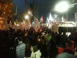 The revelations about the relationship between Park Geun-hye and Choi Soon-sil caused mass demonstrations in Seoul.[74][75] Protesters called for the resignation of Park Geun-hye.[76] On 12 November, more than one million citizens participated in the protests at Gwanghwamun Square close to the presidential residence demanding President Park's resignation or impeachment.[77] On 19 November, another one million people participated in the national protest after Park refused to help the investigation of her abuse of power.[78][79] On 26 November, more than 2 million people participated in the protest, calling for the resignation of Park.[80] Protests went on, and on 21 January 2017, a 13th protest was held in Seoul with more than 200,000 attendees.[81]