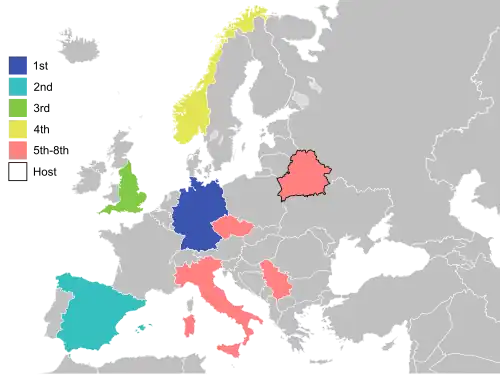 The final draw was held on 6 April 2016, 11:30 FET (UTC+3), at the Victoria Hotel in Minsk, Belarus.[7] The eight teams were drawn into two groups of four teams. There was no seeding, except that hosts Belarus were assigned to position A1 in the draw.[8]
