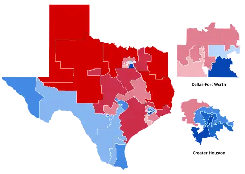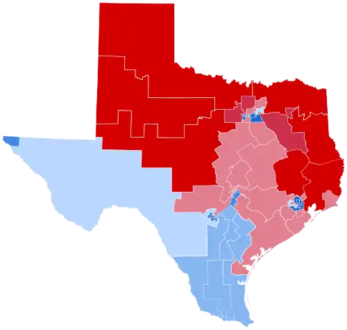 Due to Trump’s underperformance with college-educated white voters, Clinton made major gains in the Texas Triangle. Clinton scored a 38-point sweep in Travis County, home to the state capital of Austin and the University of Texas at Austin, the best Democratic performance in the county since 1964. She became the first Democrat to break 60% of the vote in Dallas County since 1944. Furthermore, she outperformed Obama in the minority-heavy counties of Bexar (San Antonio) and Harris County (Houston), shifting his slim victories into double-digit leads.[34] In fact, the Presidential vote in Texas' 7th Congressional District, which includes Houston's inner-west suburbs, had the biggest change in margin towards Clinton compared to Obama's 2012 performance outside of Utah, shifting 23 points left.[35] Clinton also won suburban Fort Bend County for the first time since Texas native Lyndon B. Johnson in 1964, which was attributed to the county's large immigrant population and negative perception of Trump by female Republican voters.[36] While Clinton didn't win heavily college-educated suburban counties such as Denton County, Williamson County, Collin County, or Hays County, her margin of defeat was much narrower than other Democratic presidential nominees.[37] Places that had large numbers of young voters in the state were a stronghold for Clinton as well.[38] Texas Lieutenant Governor Dan Patrick suggested that Trump's relatively small margin of victory could have been largely due to many moderate Republican voters who had supported Romney in 2012 staying home. In an interview conducted the morning after the election, Patrick said in reference to these voters, "Had they turned out, he would've been in the low teens".[39]